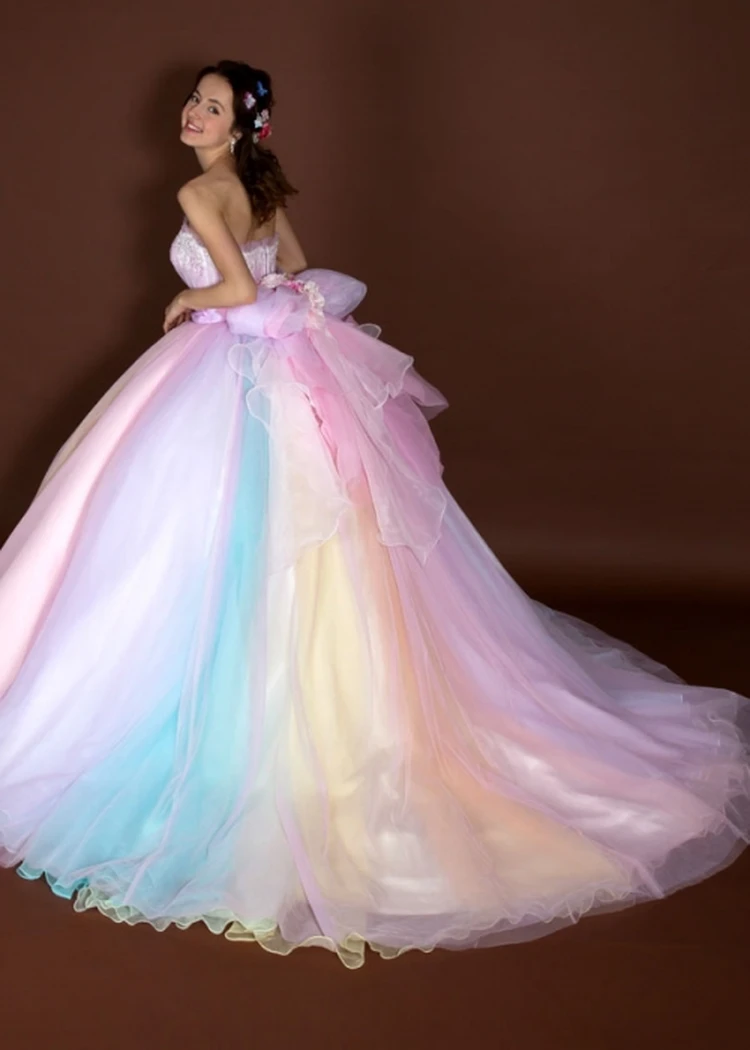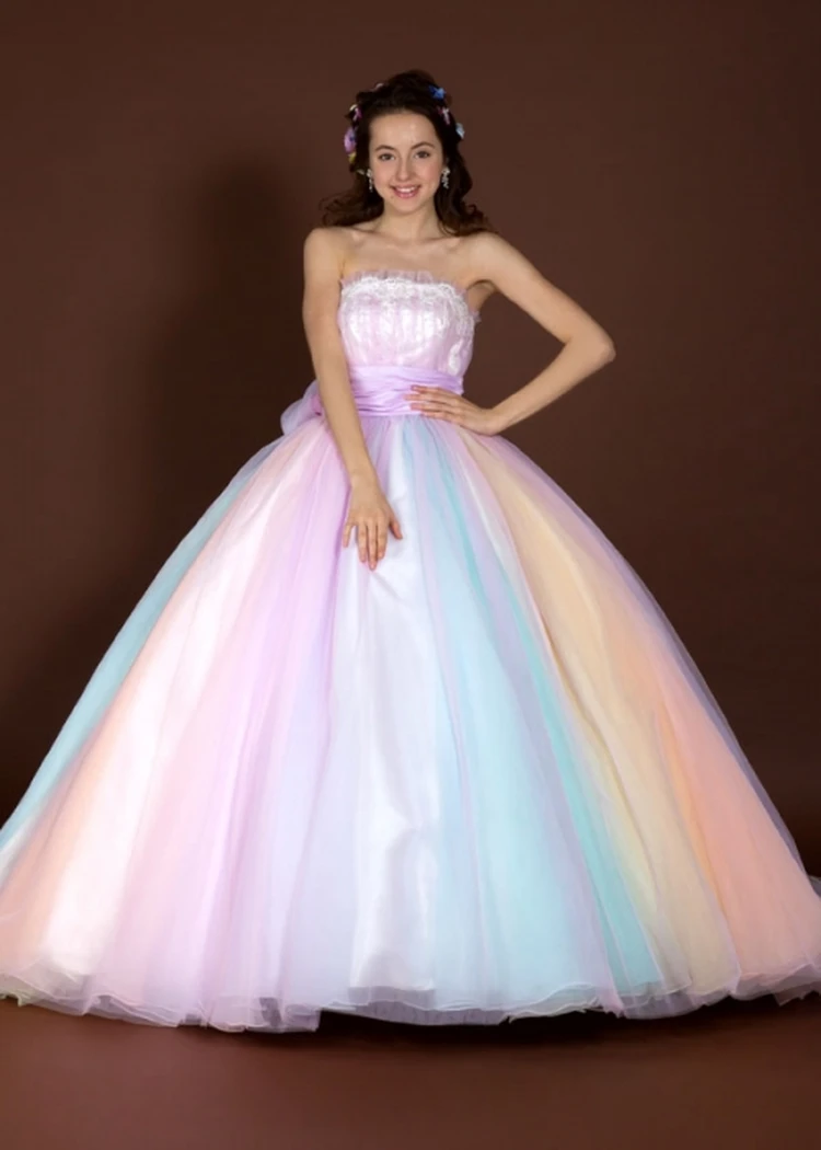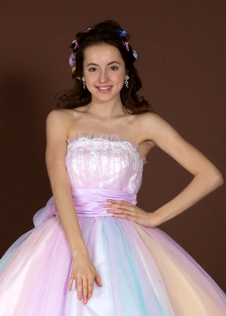 7色のオーガンジーを使用した爽やかなカラードレスです。 パステルカラーの優しい色合いで派手すぎず甘すぎず ナチュラルな姫を演出してくれます! 胸元はピンクでまとめレースにスパンコールをあしらいました。 どこから見ても華やかで軽やかな印象です!