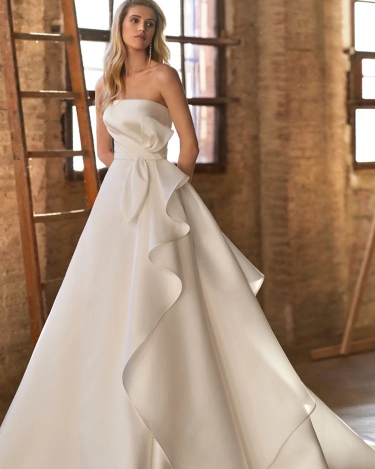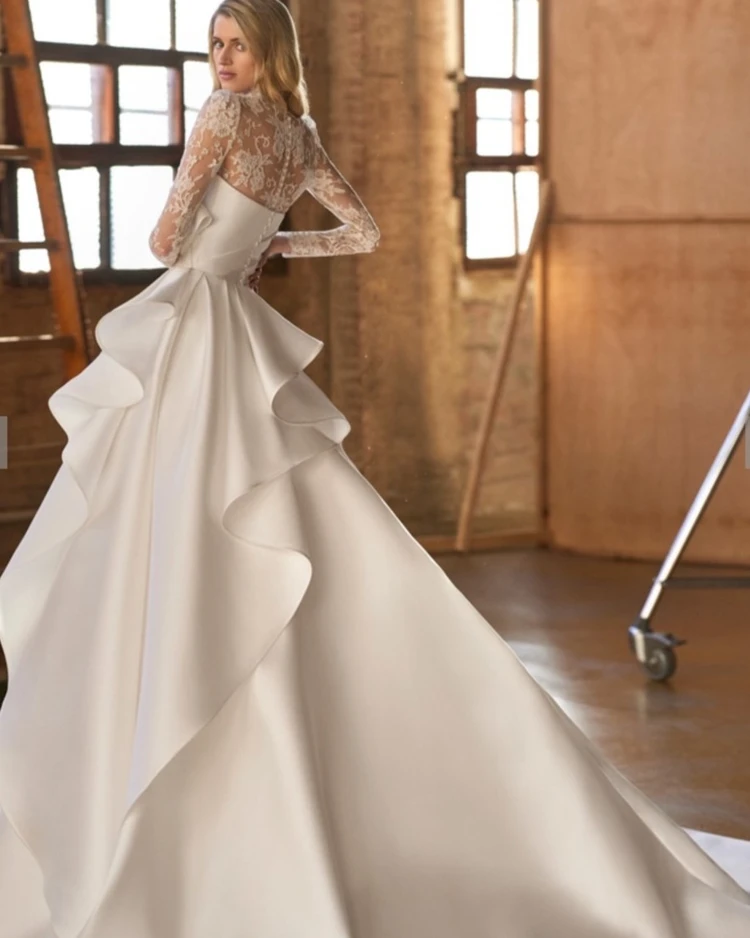 サテンの光沢とフロントのアシンメトリーリボン・バックのカスケードフリルが美しいデザイン。 付属の長袖ハイネックボレロはレブロデレースを使用し立体感と高級感がプラスされる。洗練された上質なコーディネートが叶う1着です。