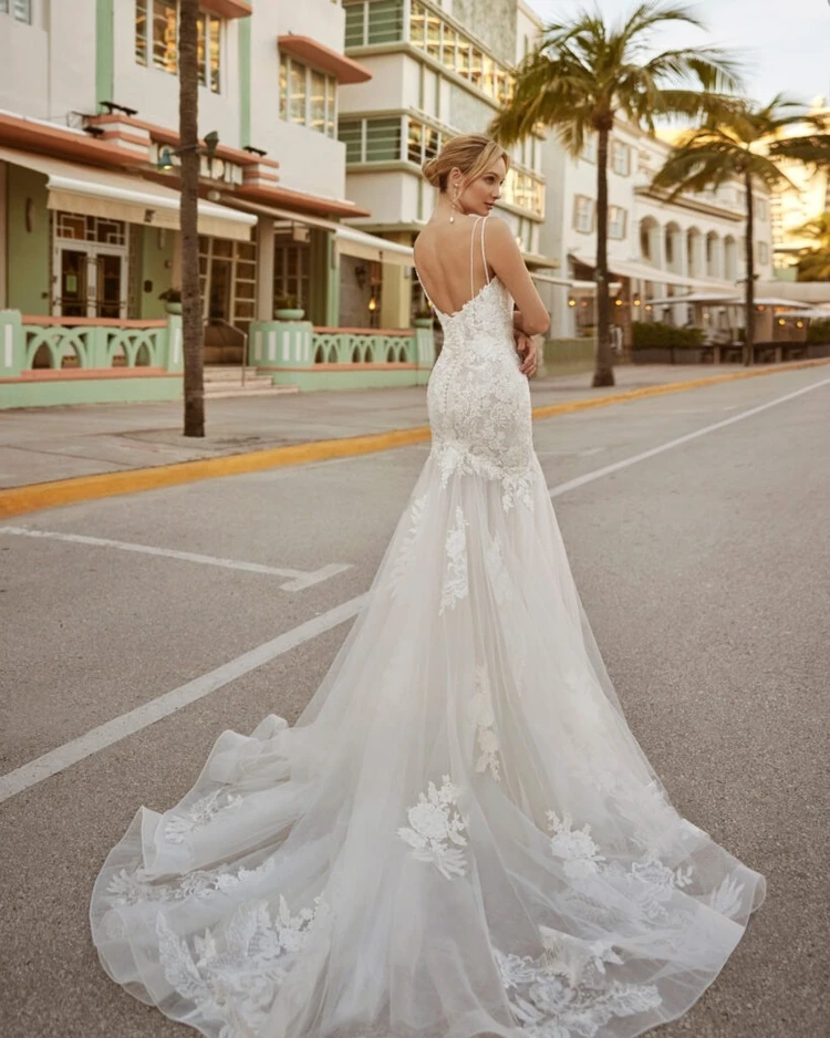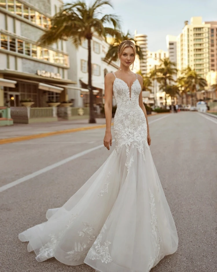 「CATA」は、ROSA CLARAの別ラインLUNA NOVIASブランドから登場した、柔らかなピンクベージュが特徴のマーメイドラインドレス。肩にはハードチュールを使用し、繊細なビージングと刺繍が華やかさを添えます。トレーンの裾には太めのパイピングが施され、丸く広がる美しいバックスタイルが魅力的な一着です。