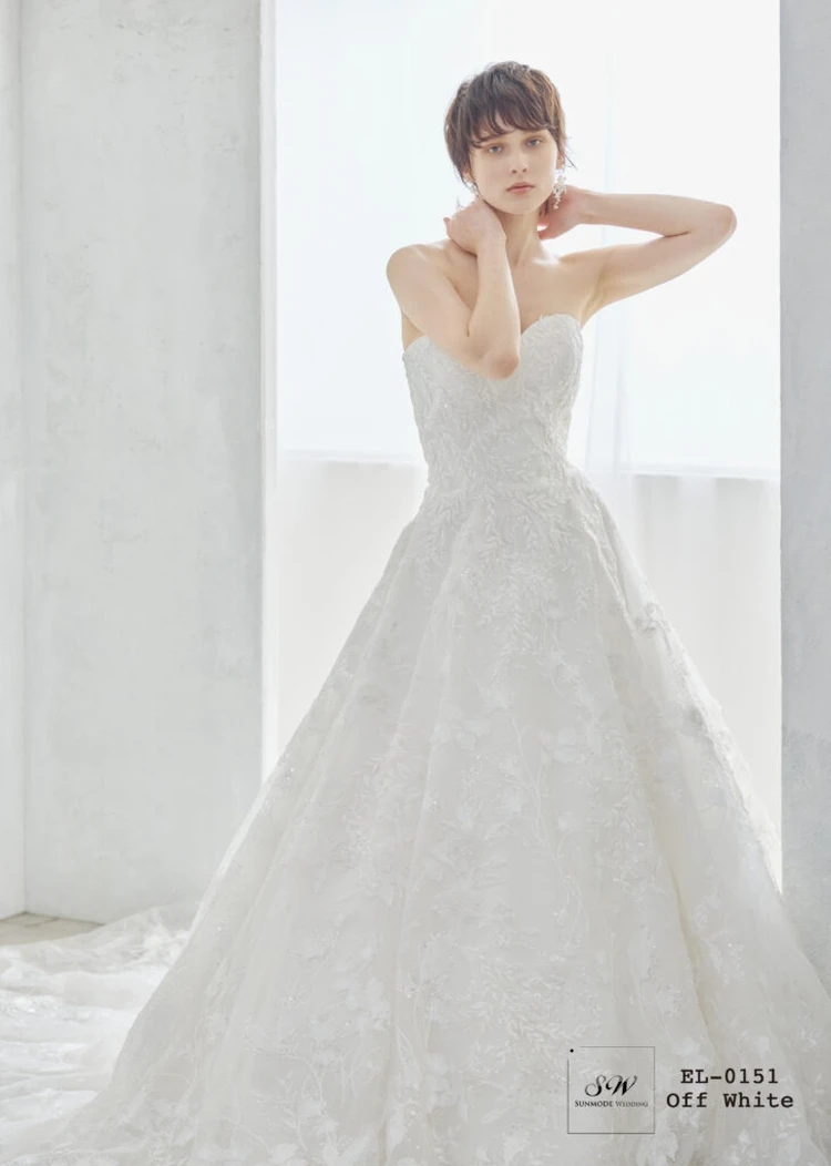 繊細なリーフモチーフのレースと、上品な輝きを放つスパンコールが全体にあしらわれた、正統派エレガントなAラインドレス。ハートカットのビスチェがデコルテラインを美しく見せ、女性らしいやわらかな印象を与えます。ロングトレーンに流れる刺繍が後ろ姿まで華やかに演出。