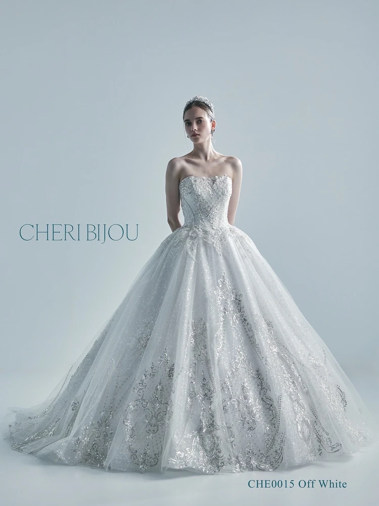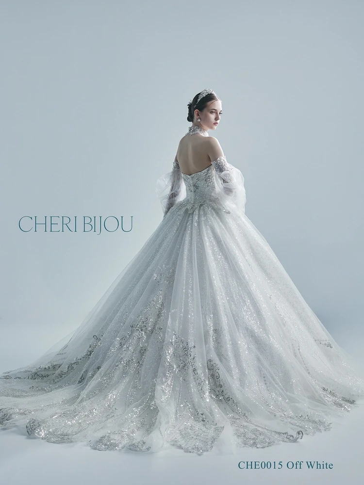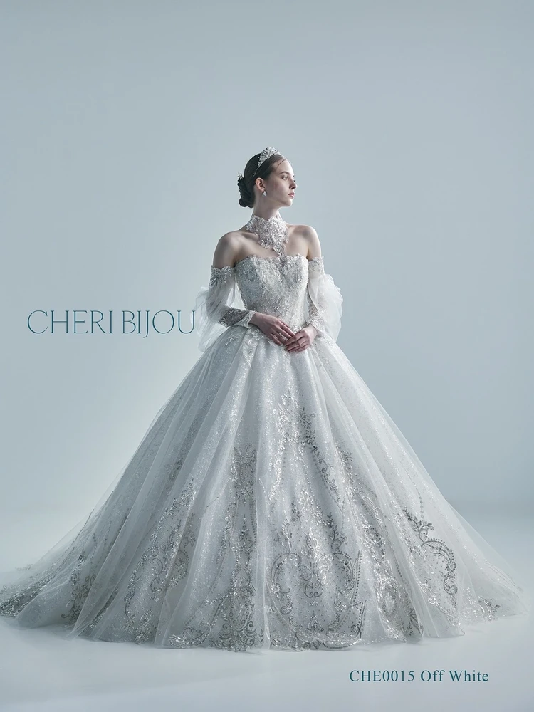 立体感のあるグリッターパールビジューチュールに更にビジューレースをON、余すところなく光り輝く圧巻のリュクスウェディング。腕にふわっと纏うチュールドレープスリーブはシースルー感が絶妙で上品でフェミニンな仕上がり、二の腕を細く見せます。まるでビジューで仕立てられたようなレースチョーカーはインパクトが絶大で首元を華やかに彩ります。ロングスリーブ、チョーカーは取り外し可能です。