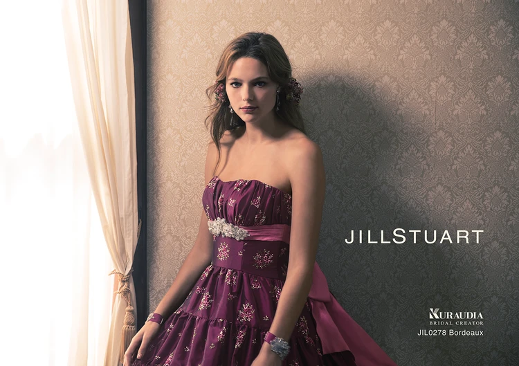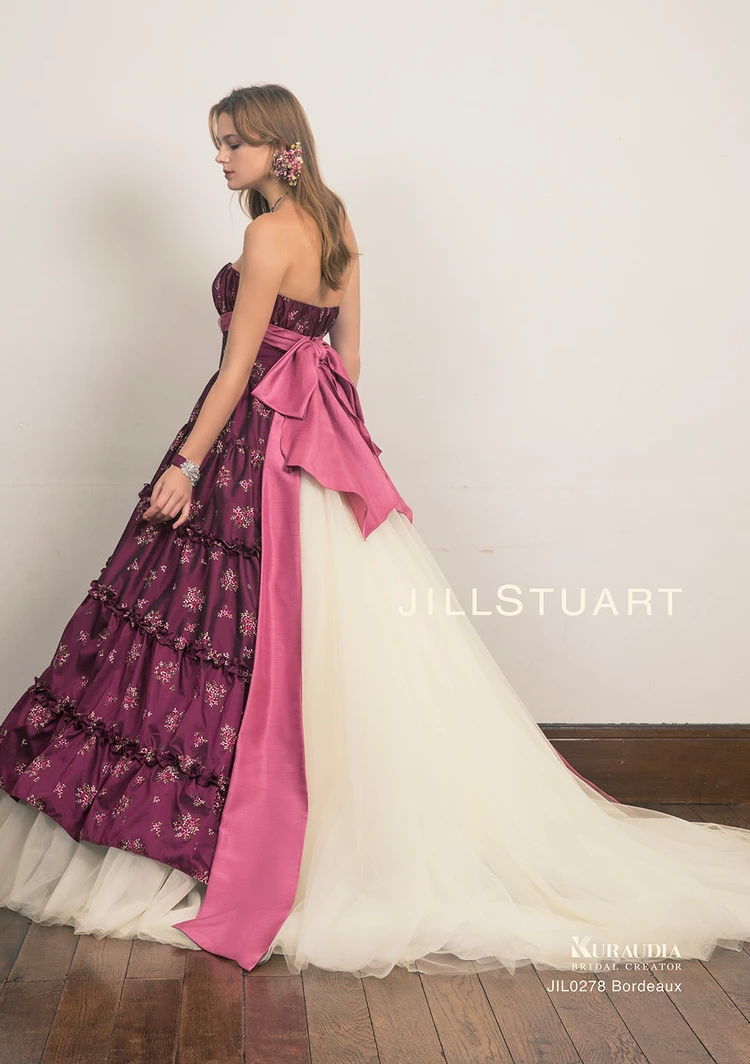小花柄の刺繍が愛らしい、フランス製のタフタを贅沢に使用した豪華でフェミニンなカラードレス。スカートの切り替えや、細やかなフリルなど、JILLSTUART(ジルスチュアート)らしいディティールのこだわりが魅力です。