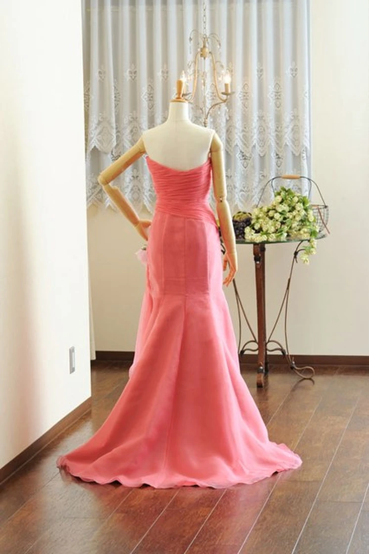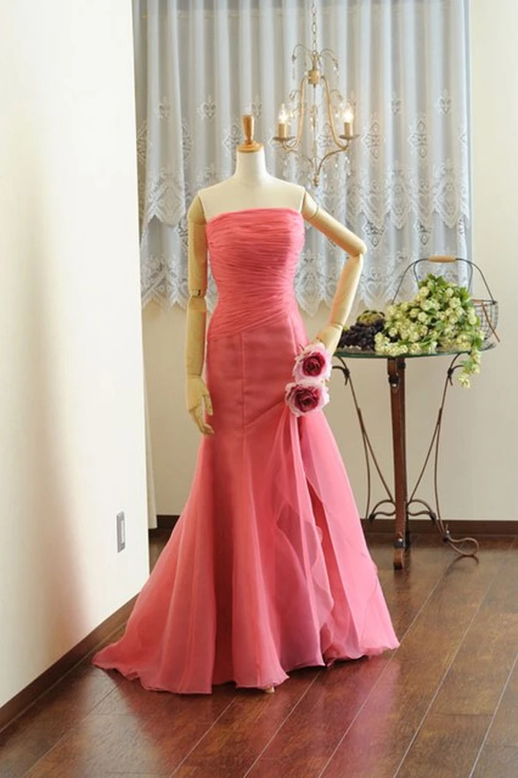 セクシーなスリット入りのスカートが特徴のデザイン、新色のカラーオーガンジーを使ったソフトマーメイドドレスです。色を合わせてお作りしたコサージュを合わせ、大人可愛い雰囲気に。