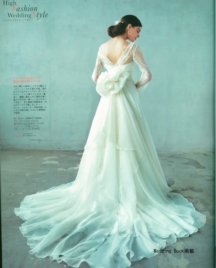 上記はレンタル価格です。 背中のV開きが美しいシルエットにエアリーなオーガンジーのロングトレーン。 セレモニーにふさわしいドレスです。