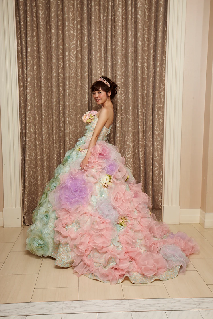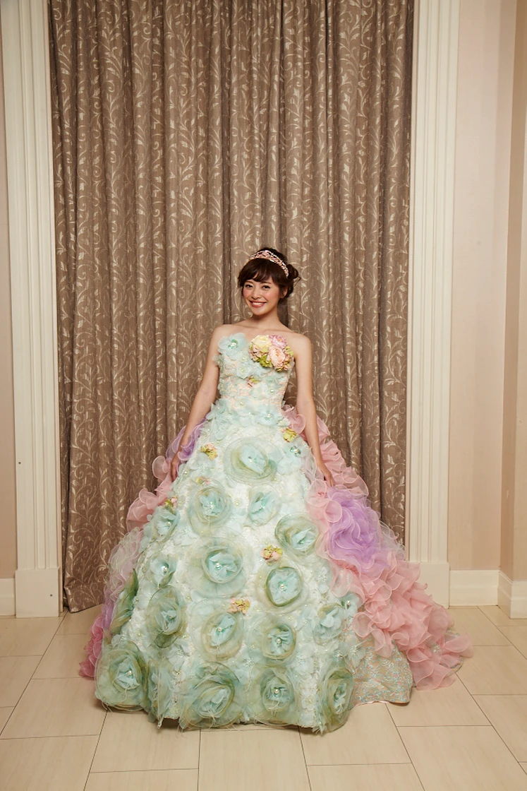 デザイナーのセンスが光るグリーン×ピンクのバイカラードレス。フロントの爽やかなグリーンに、バックはピンクのオーガンジーで咲き誇るお花を表現した会場映えも抜群の一着。カラーバリエーションはピンクとグリーンの2色展開です。