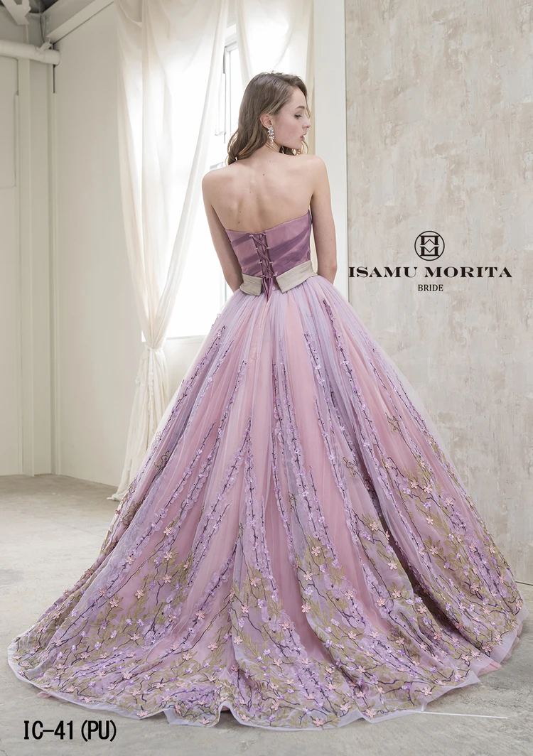 オリジナルのクラシカルモチーフのレースをゴージャスに使用したオートクチュールカクテルドレスです。柔らかな色調で重ね合わせた身頃デザインは、柔らかな女性の印象を際立たせます。取り外しのトレーンの着脱により、様々なシーンの演出も可能です。