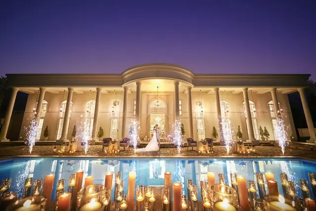 JR郡山駅から車で約10分の白亜の邸宅「アーククラブ迎賓館(郡山)」。 華やかなフラワーバージンロードに、お色直しの入場は憧れのシンデレラ階段。 プール付きの緑豊かなプライベートガーデンではデザートブッフェや花火など2人にあったパーティを。 キャンドルを埋め尽くしオレンジ色の灯に包まれたナイトウェディングも人気です。