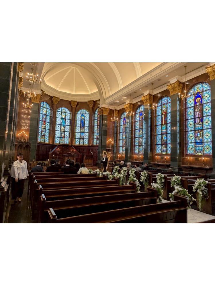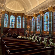 挙式会場はヨーロッパの歴史ある教会を思わせる、クラシカルで厳かな雰囲気が漂っていました。特に目を引くのは、大きく美しいステンドグラス。色とりどりの光に包まれながら、パイプオルガンと聖歌隊の荘厳な歌声が響く中での挙式は、とても感動的で一生忘れられない時間となりました。私はイギリスやフランスのような海外のクラシックな雰囲気が好きで、まさにイメージ通りの空間だったので、この会場を選んで本当に良かったと感じています。参列してくれた友人や家族からも「神聖で厳かな気持ちで式を見ることができた」と言ってもらえ、特別な時間を共有できたことを嬉しく思いました。写真映えも抜群で、当日の写真を見返すたびにその美しさを思い出します。