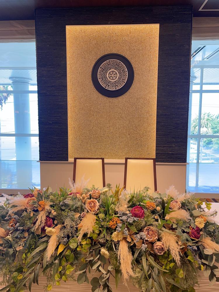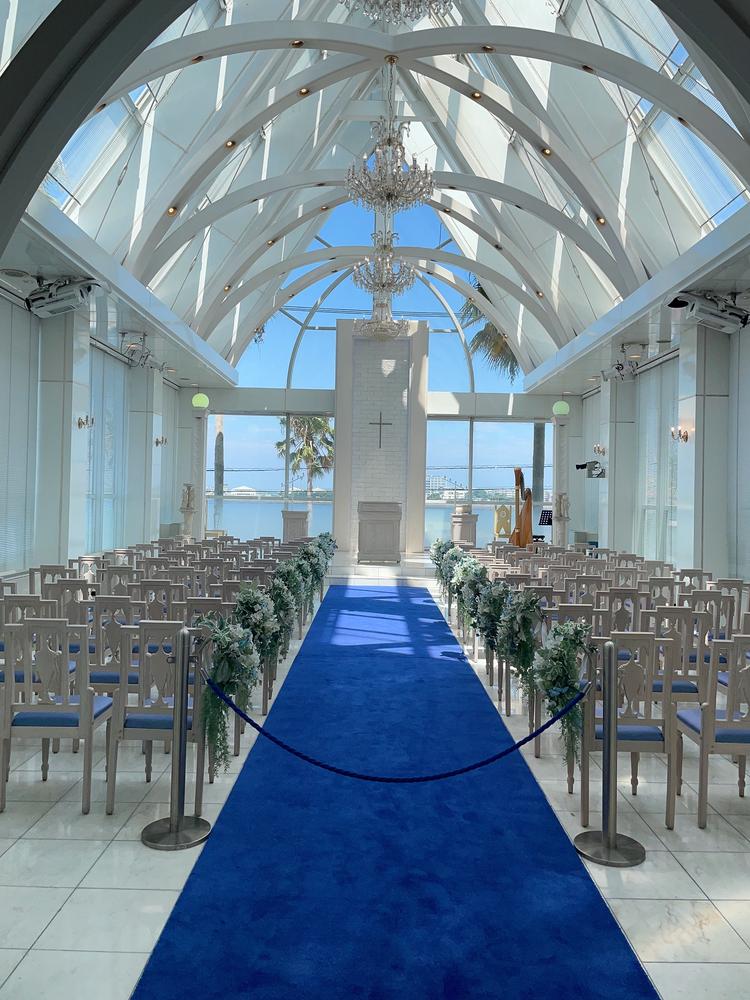 チャペルも披露宴会場も窓から海が見えてリゾート気分が味わえます。青いバージンロードも素敵です。