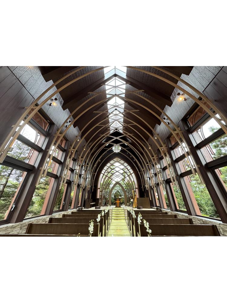 ガラスのチャペルが、木の温かい雰囲気を醸し出していて印象的でした。クリスタルチャペルも明るく良かったですが、ガラスのチャペル天井の丸みを帯びたアール状の構造が素晴らしく、ここで挙式を挙げてみたいと思いました。