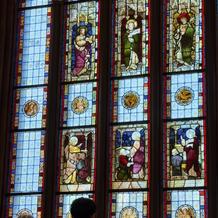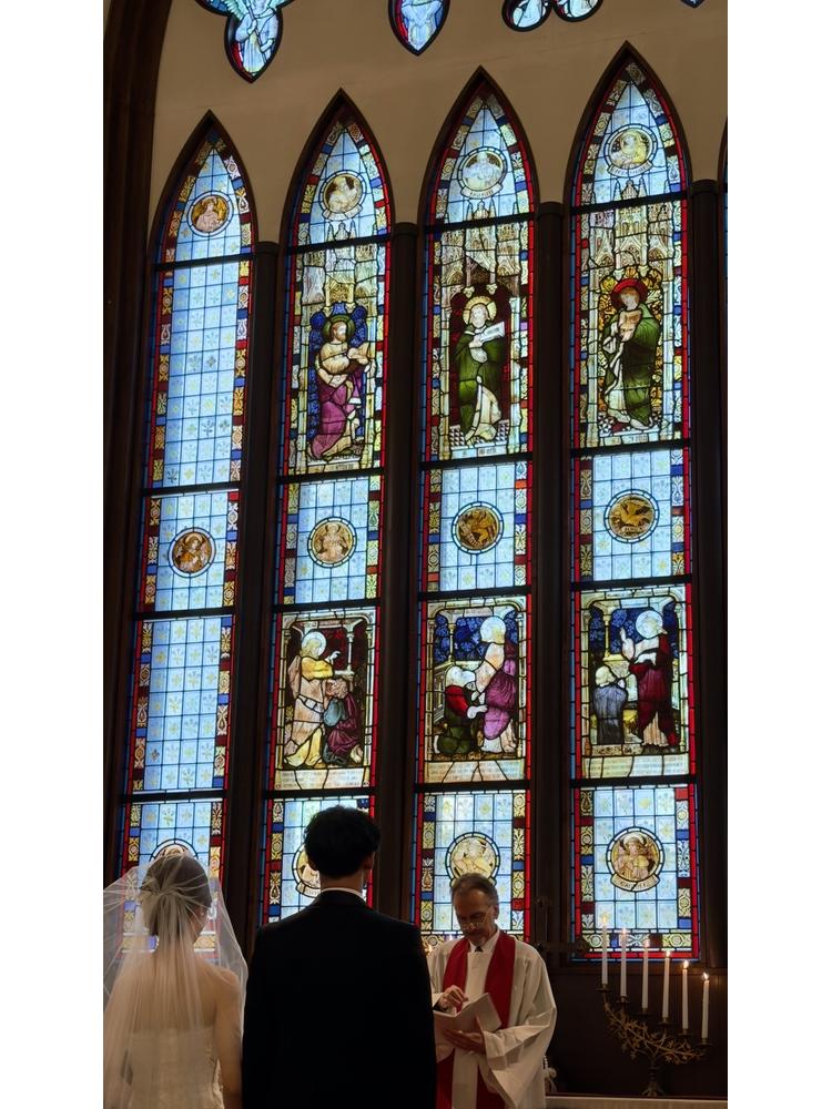 正面の大きなステンドグラスが印象的で、天候に左右されず綺麗な見た目になります。