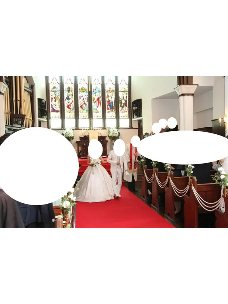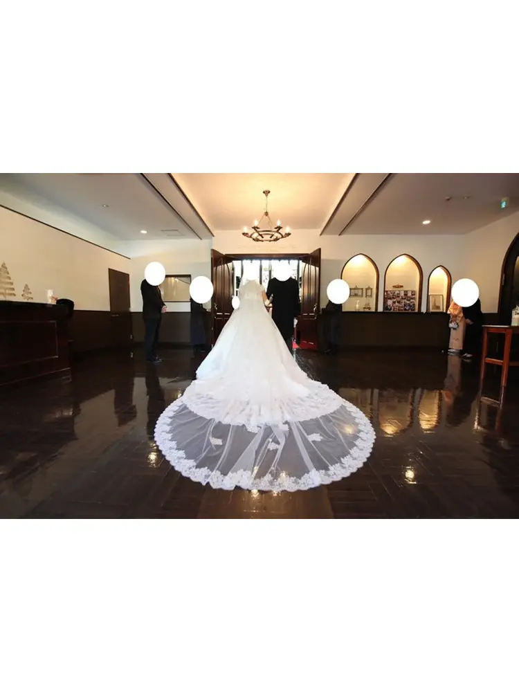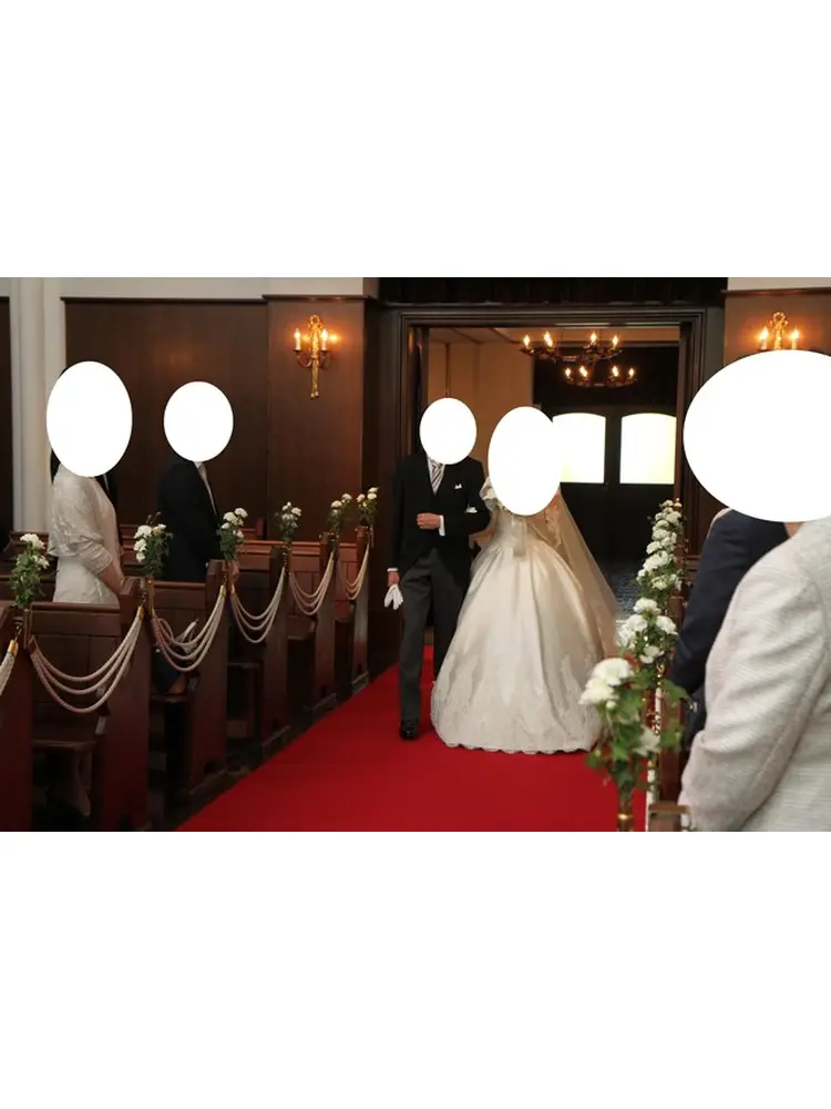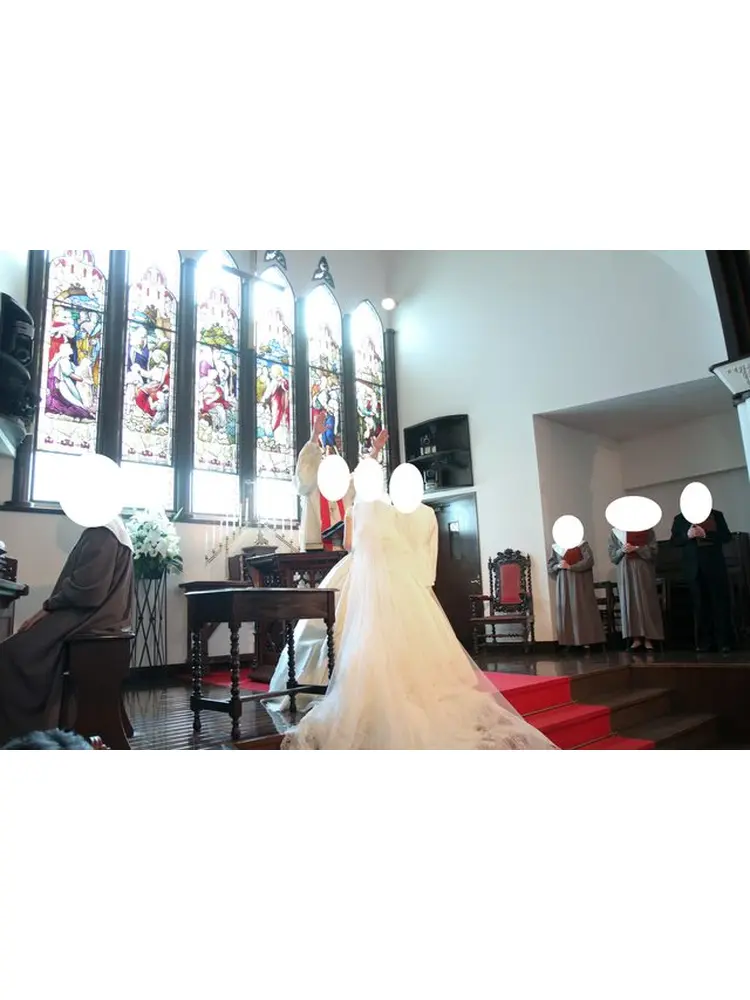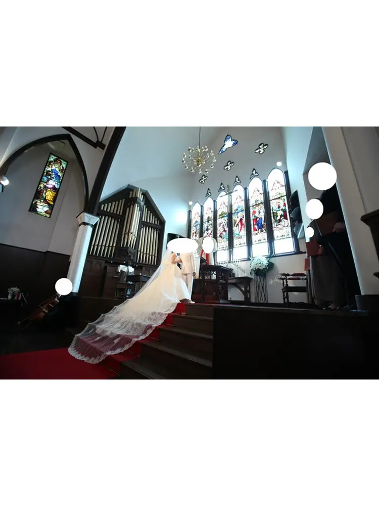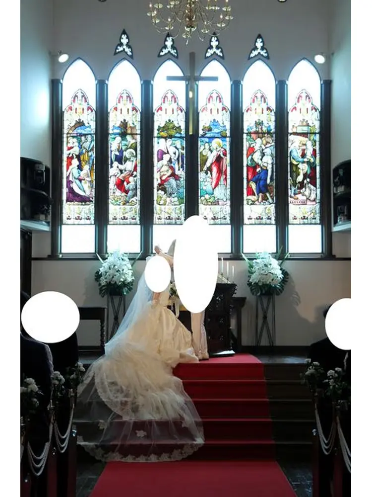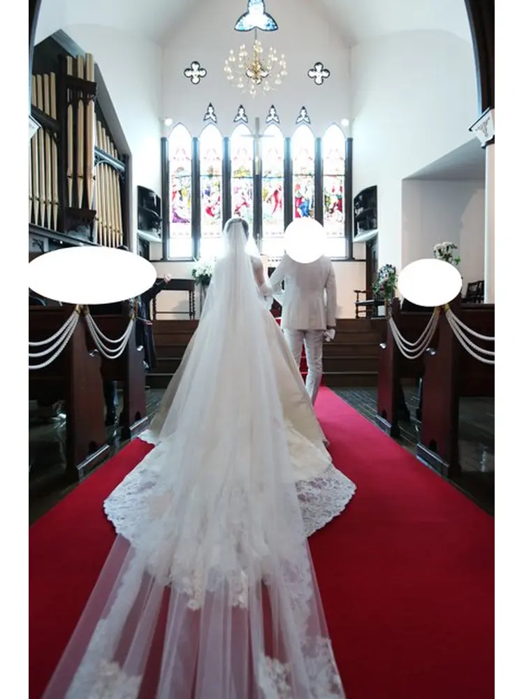 ・バージンロードには赤い絨毯が敷かれており、また祭壇部分は階段になっているので、後ろのほうの席のゲストからも見やすい構造になっていてよかったです。また、ロングトレーン、ロングヴェールがとても映える教会でした。