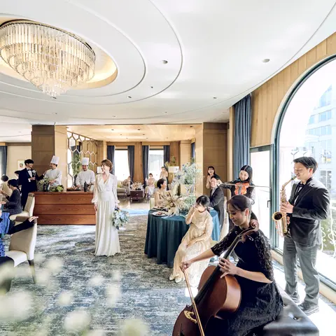 フロア毎に異なるウエルカムパーティのフード&ドリンクが全額無料!ふたりでつくる燻製・焼き立てブルスケッタ・お茶を使ったお酒や生ハムのカッティングサービスなど、他の結婚式場では体験できないオリジナルな内容を!