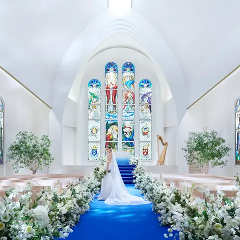 独立型の大聖堂チャペルを大解放!「永遠」の意味の込められたロイヤルブルーのバージンロードには、純白のウェディングドレスが美しく映えます。