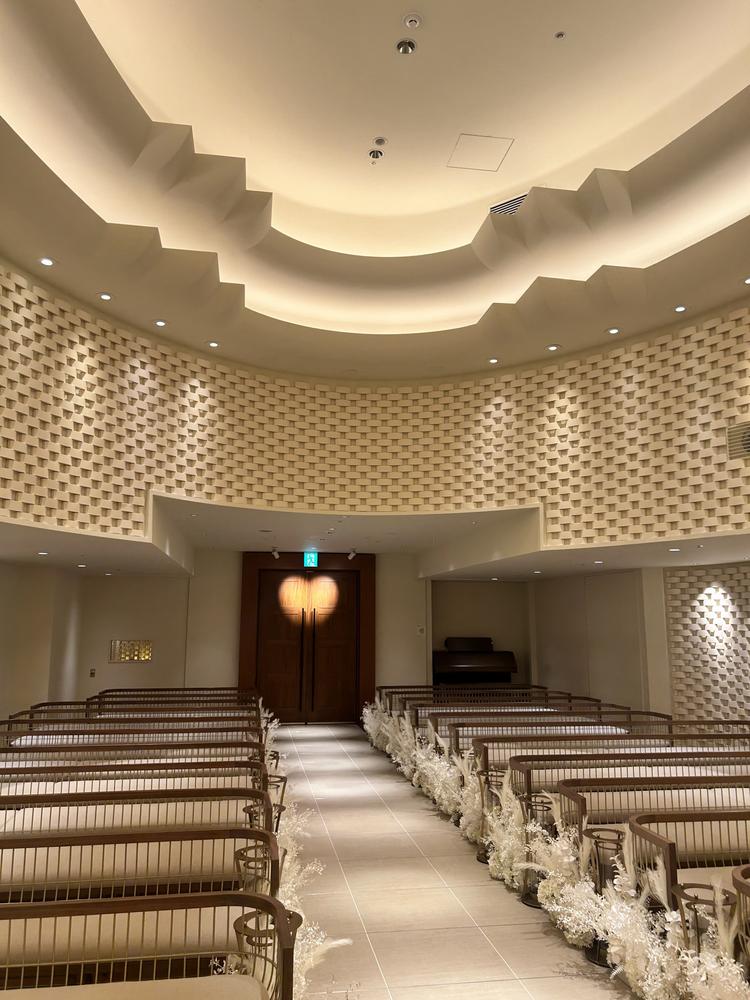 チャペル:人通りの多い通路から奥に入った位置にあり、静寂を感じられる空間になっていると感じました。中は白を基調としていて落ち着いた雰囲気でありつつ、温かみもありました。チャペルは窓がないですが、写真撮影などにはテラスを使用できるそうです。テラスはスカイツリーやレインボーブリッジが見えて気持ちよかったです。