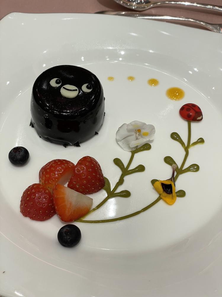 デザートはSuicaのペンギンケーキを選んだのですが、最高に可愛かったです。Suicaと一緒に写真を撮って楽しんでるゲストもいました。