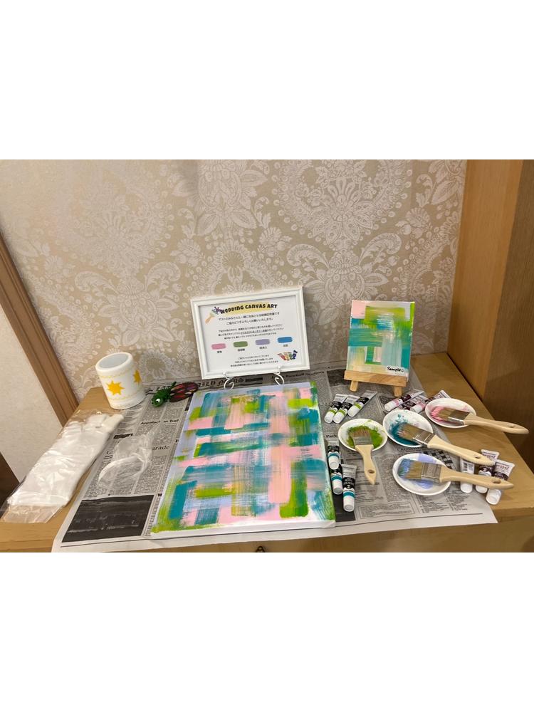 人前式がやりたくて挙式は人前式にしたのですが、演出の一つにウェディングキャンバスに自分たちで絵の具で名前を描きたいという希望はNGな式場さんもありそうな中、全然OKとのことで素敵な結婚証明書がつくれました!