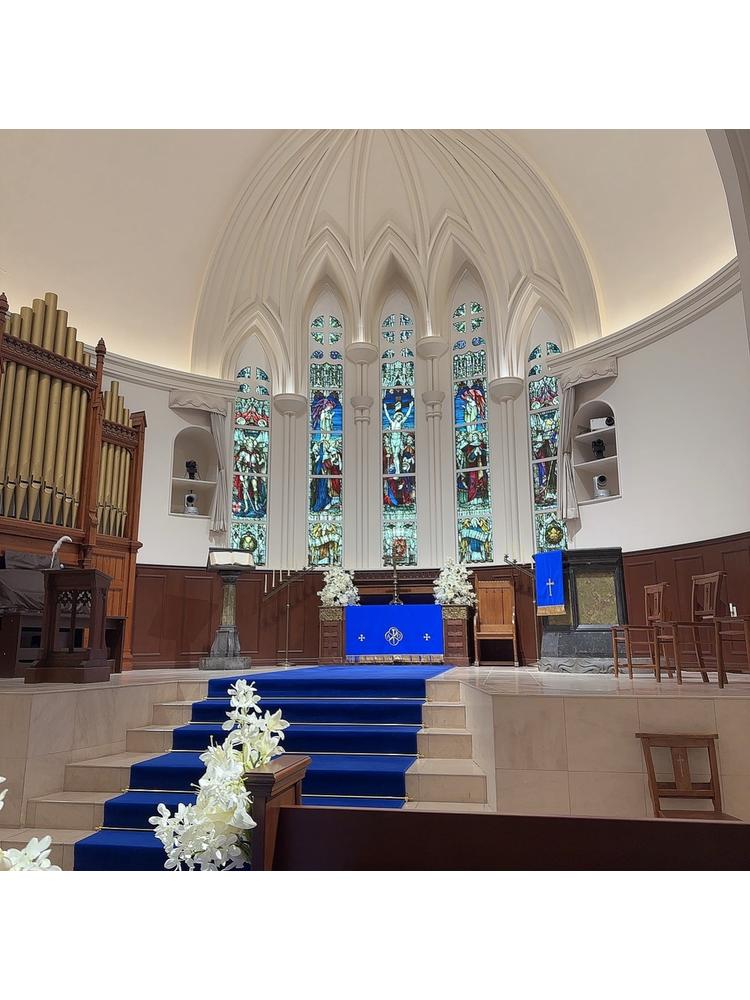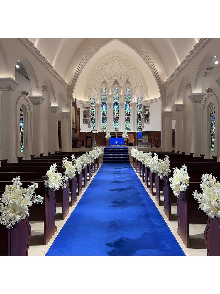 青のバージンロードとステンドグラスがとても素敵。