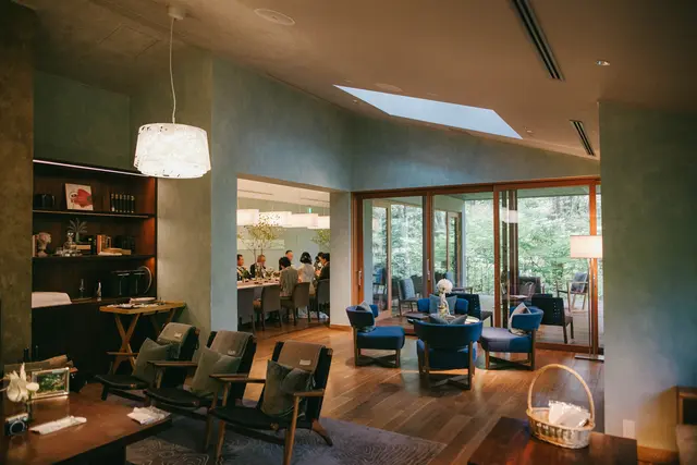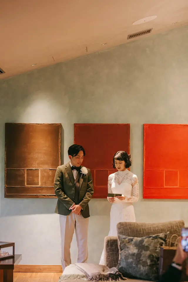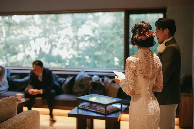 同じように滞在型のウェディングをしていたtatsuさんのご友人を見て、滞在型のウェディングに好感を持っていたおふたり。星のやのホテルなら滞在するのにも間違いないと思ったそうです。いくつか候補にあったエリアのなかで、来てもらうのに大変なほど遠すぎず、特別感を感じてもらえるように近すぎないエリアの軽井沢を選ばれました。会場には、リビングルームやダイニング、キッチンがあり、まるで別荘に来たかのような雰囲気がお気に入りだったそう。