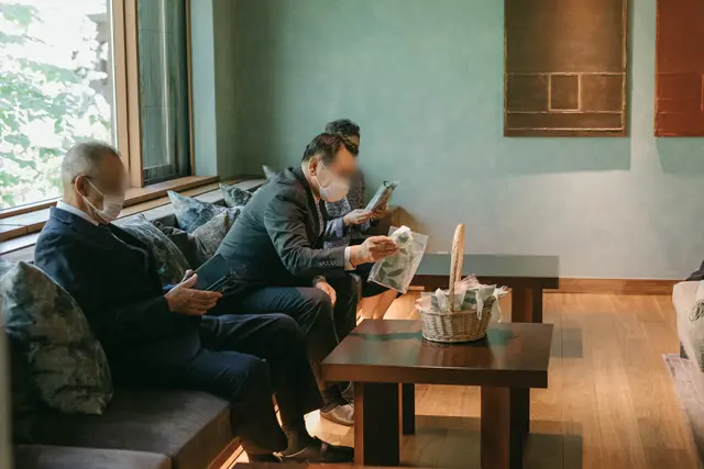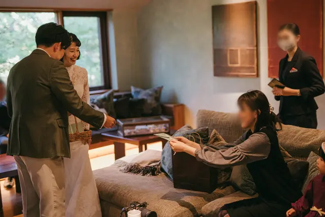 両家のお父さまどうし、お母さまどうしでくつろぐことができる空間。おふたりで用意したマスクケース、ウェットティッシュ、アルコール消毒が入ったウェルカムグッズも興味深く手に取ってもらえるなど、ご家族ならではのゆったりとしたひとときとなりました。
