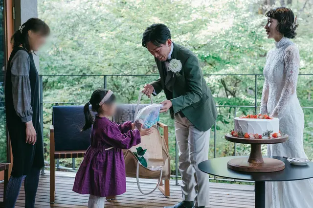 ケーキセレモニーはもともとおこなうつもりはなかったおふたり。というのも、まったく盛り上がる想像ができないと感じていたからでした。しかし、打ち合わせ時にケーキのセレモニーがないとデザートがないことを知り、盲点だったおふたりはびっくり。また、ケーキセレモニーに込められている意味を知り、現在までセレモニーが続いていることも初めて納得できたとのこと。SNSでさまざまなケーキセレモニーがあることを知り、姪っ子ちゃんに食べてもらうのが一番いいとおふたりで決めました。サンクスバイトとは少し違うけど、これからよろしくねという気持ちを込めたひとくちと、姪っ子ちゃんへのプレゼントを贈りました。
