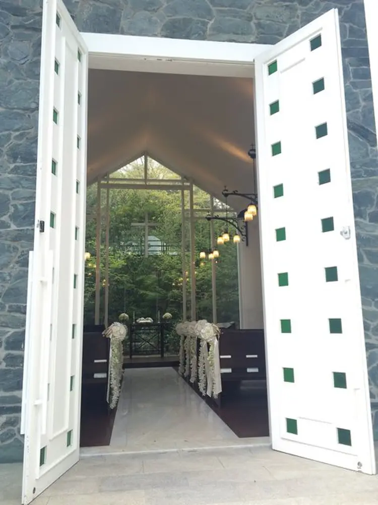 バージンロードがもう少し長いと個人的には嬉しかったですが、正面、また入り口外ともに木々に囲まれているため、大自然を感じることができて素敵です。
