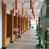 神前式希望で神殿の見学をしました。参道になっている場所が石畳み風で和風の装飾もあり、ガラス張りのおかげもあってか素人のスマホの撮影でも本当にきれいに撮影できる素敵な参道です。前撮りでも人気の撮影スポットのようです。神殿の中も、本当に神社の社屋の中にいるような雰囲気で素敵です。