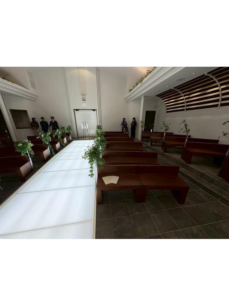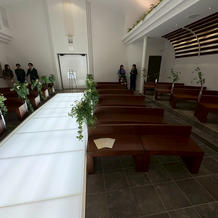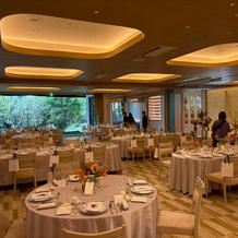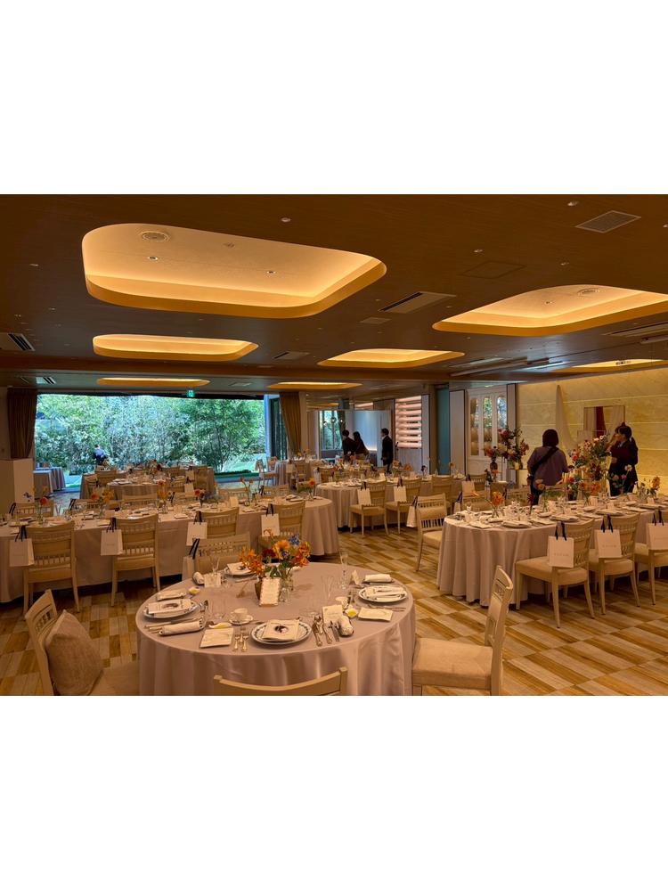 挙式会場はイスが4列で並んでおりゲストとの距離が近いです。披露宴会場は天井は低いですが、横に広い為圧迫感はないです。温かみのある照明で綺麗でした。
