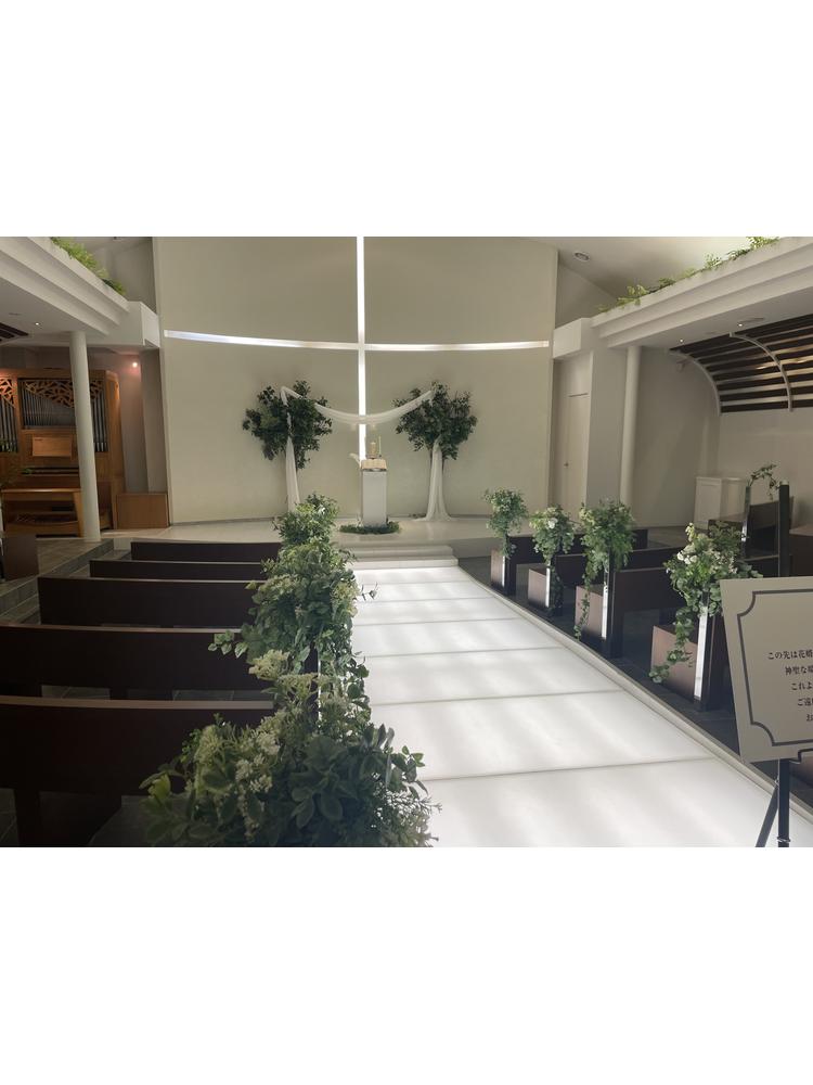 挙式会場は、ゲストとの距離が近く、あたたかい雰囲気に包まれた素敵な場所。バージンロードが光っているのも素敵だった。