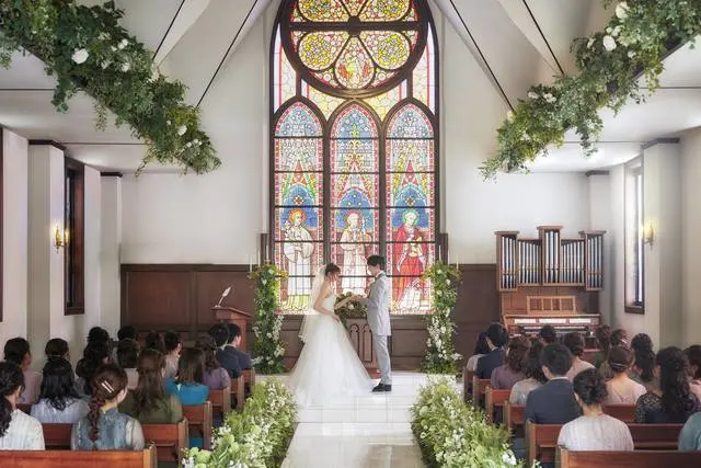 アンティークなステンドグラスの幻想的な光とパイプオルガンの調べが調和した厳粛なセレモニー。おふたりの誓いは永遠に色あせることなく心に刻まれます。挙式後は、感動の余韻を感じながらフラワーシャワーで祝福をうけます。
