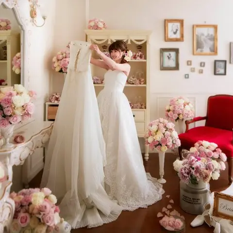 新婦様がお支度をする大切な場所…ブライズルーム。そんなお部屋だからこそ料金はいただけません。夢の花嫁姿に染まっていく