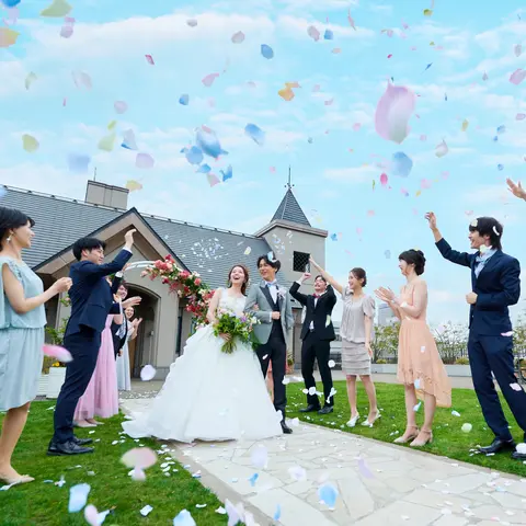 チャペルに隣接したガーデン♪ 空と緑と色とりどりの花々に囲まれたプライベート空間でアフターセレモニー