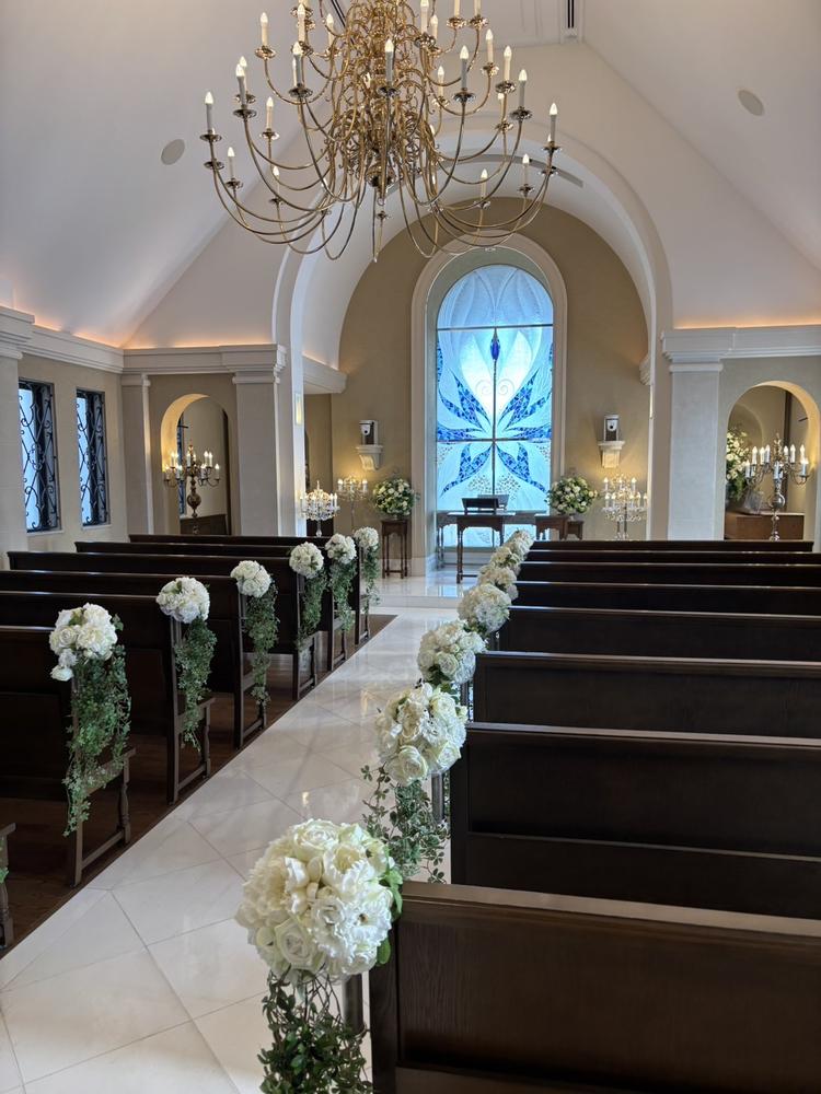 チャペルは青と白が基調のステンドグラスがあり、バージンロードにもお花があってとても綺麗で神秘的だった