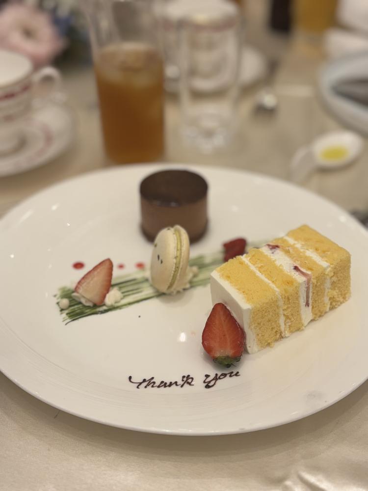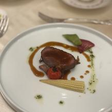 グレードによってお肉の種類が異なるため、牛肉までグレードを上げて、さらにデザートもグレードを上げてフォンダンショコラを出していただくようにしました。お肉など当日私たちはあまり食べられなかったのですが、ゲストからとても好評でした。お色直し中に食べやすいように切った料理を出してくださったり、式終了後にメッセージ入りのプレートでウェディングケーキを出してくださり、スタッフさん方の気遣いに感動しました。