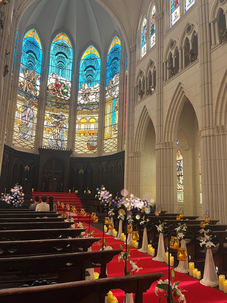 圧巻の大聖堂のステンドグラスや綺麗な披露宴会場、おしゃれなゲスト控え室など、親族もゲストも大好評の設備でした
