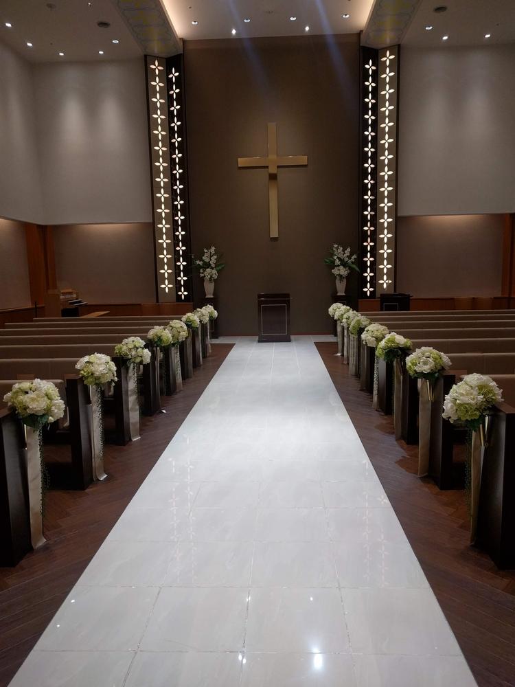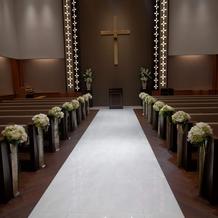チャペルは白と茶色が基調で落ち着いた雰囲気でした。椅子がクッションになっており参列者も楽だと思います。