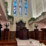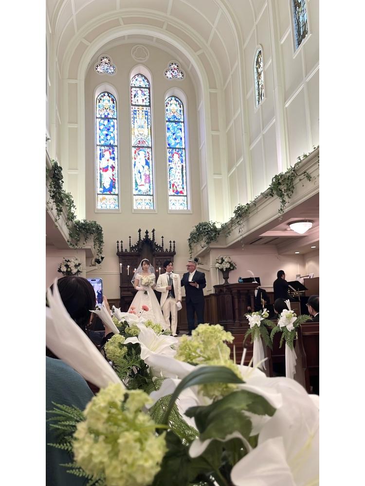 ステンドグラスが美しく、白を基調とした天井の高い会場です。背面にはパイプオルガンもあり、雰囲気があります。