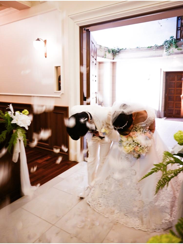 【挙式】退場時にフェザーシャワーを降らしてもらいました