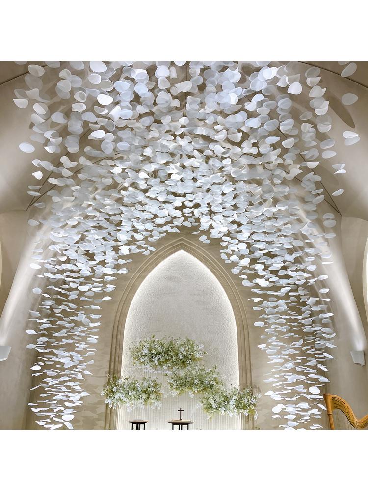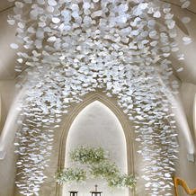 挙式会場は、天井から花びらをモチーフしたものがいっぱい吊り下げられており素敵でした。