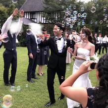 挙式後は石の強化の外でゲストが2列になって、ライスシャワーをしてくれます。