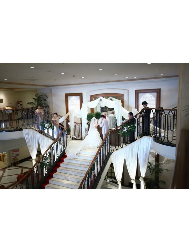 外観、内装はこじんまりとした小さなホテルです。一瞬ビジネスホテルと勘違いされるほどですが(笑)でも内装はまず入って正面ロビーに大階段に大きなシャンデリア、噴水があり小さいながら華やかさはあります。挙式はこのロビーかチャペルかで選べます。私達はロビーで挙式を行ないました!とても緊張しましたが、ロビーでの挙式は他の宿泊者の方などからも祝福をしていただいたり、とても写真映えもしますし本当にお姫様のようになった気分でした!そのままフラワーシャワー、ブーケトスなども出来ました!