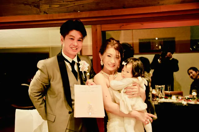 実際の挙式では、ベールアップした瞬間から泣き出してしまっていたそう。しかし、牧師さんから「抱っこしますか?」と声をかけてくれ、お子さまを抱きながら挙式を進めてくれたとのこと。退場の際は「一緒に退場しましょうね」と笑顔で言ってくれ、咄嗟にそのような素敵な対応をしてくれたことが本当に嬉しかったそうです。3人での写真もたくさん残してくれていて、とても良かったと嬉しそうにお話ししてくれました。はじめは、お子さまがいる結婚式はどうなるかわからず不安もあったようですが、思い出として振り返ったときに大事なお子さまと一緒にできて嬉しかったとのことです。こういったシーンも、自分たちらしさを感じられる良い思い出になり、将来お子さまと笑いながら話せるエピソードにもなったため、お子さまがいても挙式をして本当に良かったとおっしゃっていました。