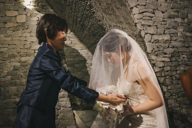 サツキさんのお母さまによるベールダウンが、とても心に残っているとお話ししてくれました。石の教会では、教会に入る前に、外でベールダウンがおこなわれるルールがあるそうです。ゲストの前ではなく、お母さまとふたりきりの空間だったからこそ、お母さまからの「きれいだよ」という言葉をもらえたり、ゆっくり向き合う時間をつくれたりしたことが良い思い出になったとのこと。何より、挙式をすることに決めた最初のきっかけは、お母さまからの「挙げてほしい」という言葉だったからこそ、ベールダウンの瞬間に、準備を頑張ってきてよかったという気持ちや、お母さまに喜んでもらえたことへの嬉しい気持ちが込み上げてきたそうです。