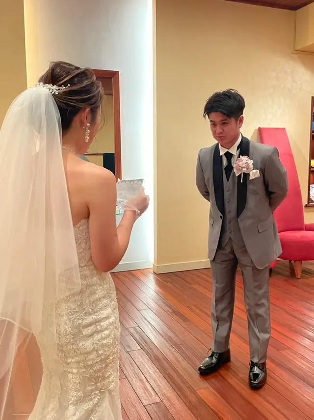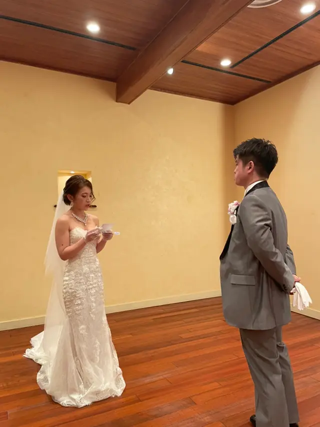 挙式前に、サツキさんからカンタさんへお手紙を読み上げる時間をつくられたそうです。サツキさんの妹さまが亡くなられた際、大きな支えとなってくれたのがカンタさんだったとのこと。ご家族の大切さを心から実感し、失いたくないと強く感じたことをきっかけに、結婚式という機会にこそカンタさんに伝えなければならない気持ちがあると思い、実行したそうです。