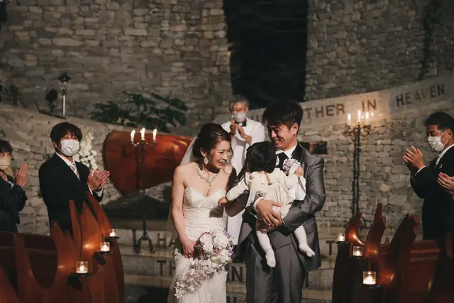 もともと旅行が好きなおふたりが初めて行った旅行先は軽井沢だったそう。結婚式を挙げた場所に、今後も旅行先として訪れられる場所が理想ということで、軽井沢の石の教会で挙式をすることに。イルミネーションが大好きなサツキさんは、夜のキャンドルウェディングやクリスマスシーズンの挙式に憧れを抱いており、その希望を叶えられる結婚式をつくられました。おふたりのお子さまと共におこなったファミリーウェディングは、良い節目として素敵な思い出になったそうです。