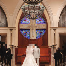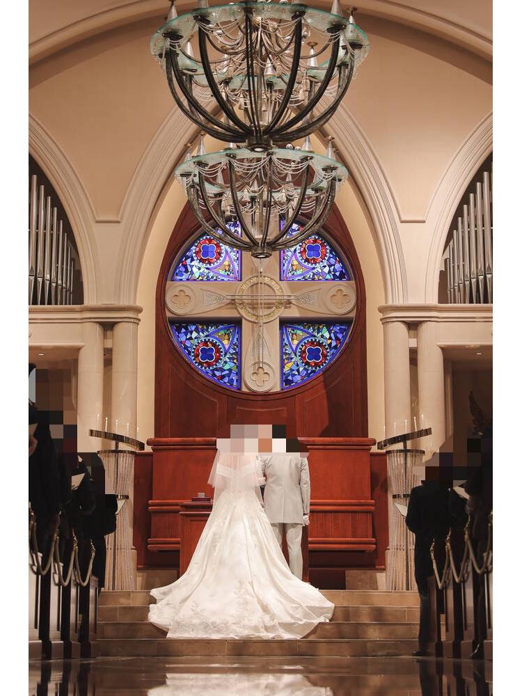 ステンドグラスの美しい、天井の高い厳かな教会です。披露宴会場も教会と同じ建物内を選んだので、自分たちもゲストも親族も移動による負担がありませんでした。