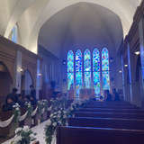チャペルは美しくステンドグラス。終了後は外階段からブーケトスもできる。立地回りの交通は多くなく、雑音が少ないため日常から離れた挙式ができる。