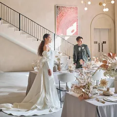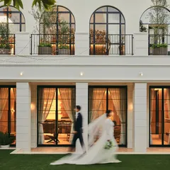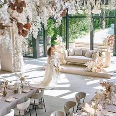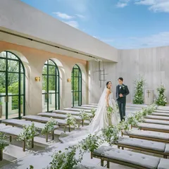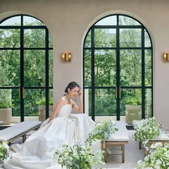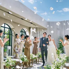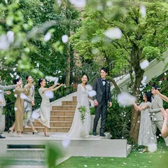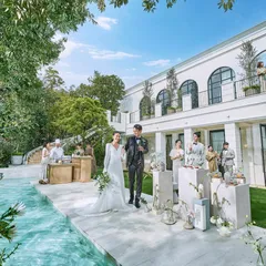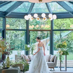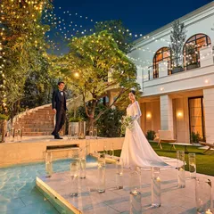 南青山、外苑前駅から徒歩5分にある「青山迎賓館」。天井が開閉式のチャペルのテーマは空、光、水。青空の下で心地よい挙式を叶えます。プールのある中庭や、大きな窓から光が差し込む開放感あふれるパーティー会場。一軒家完全貸切りだから叶う、プライベートな空間でゲストとの幸せなひとときを。