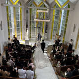 チャペルが小さな森の中にある感じです。当日は小雨が降っていたのですが、チャペルまでの通路には屋根があり、入り口のところではスタッフの方が大きな傘をさしてくださっていました。