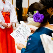 神前式では難しい文章を新郎新婦が読み上げたり、真榊奉納の手順があったりと少し難しく感じるものもあるのですが、リハで押さえるべき要所を分かりやすく伝えて下さったので、不安なく進行に集中できました。